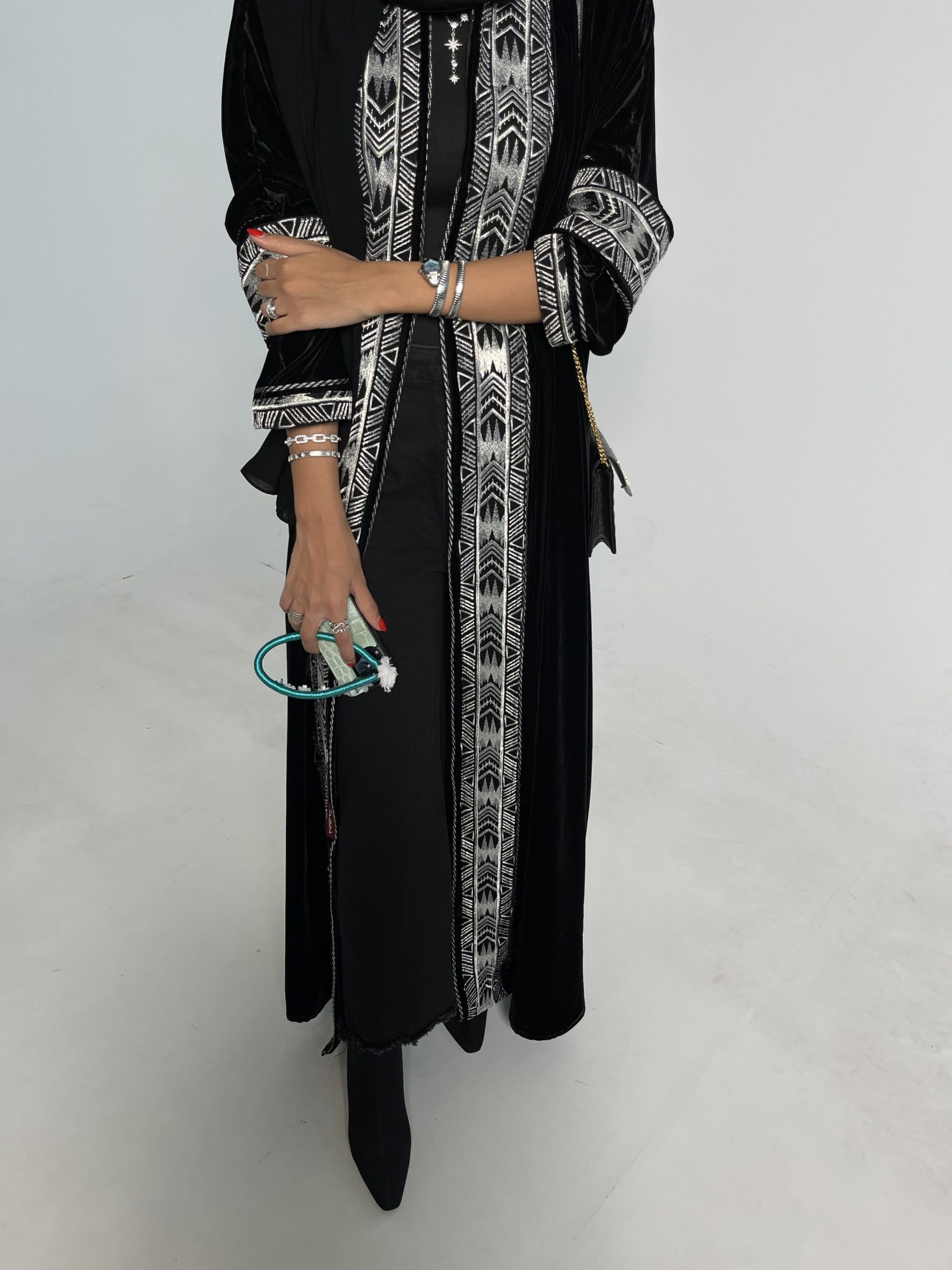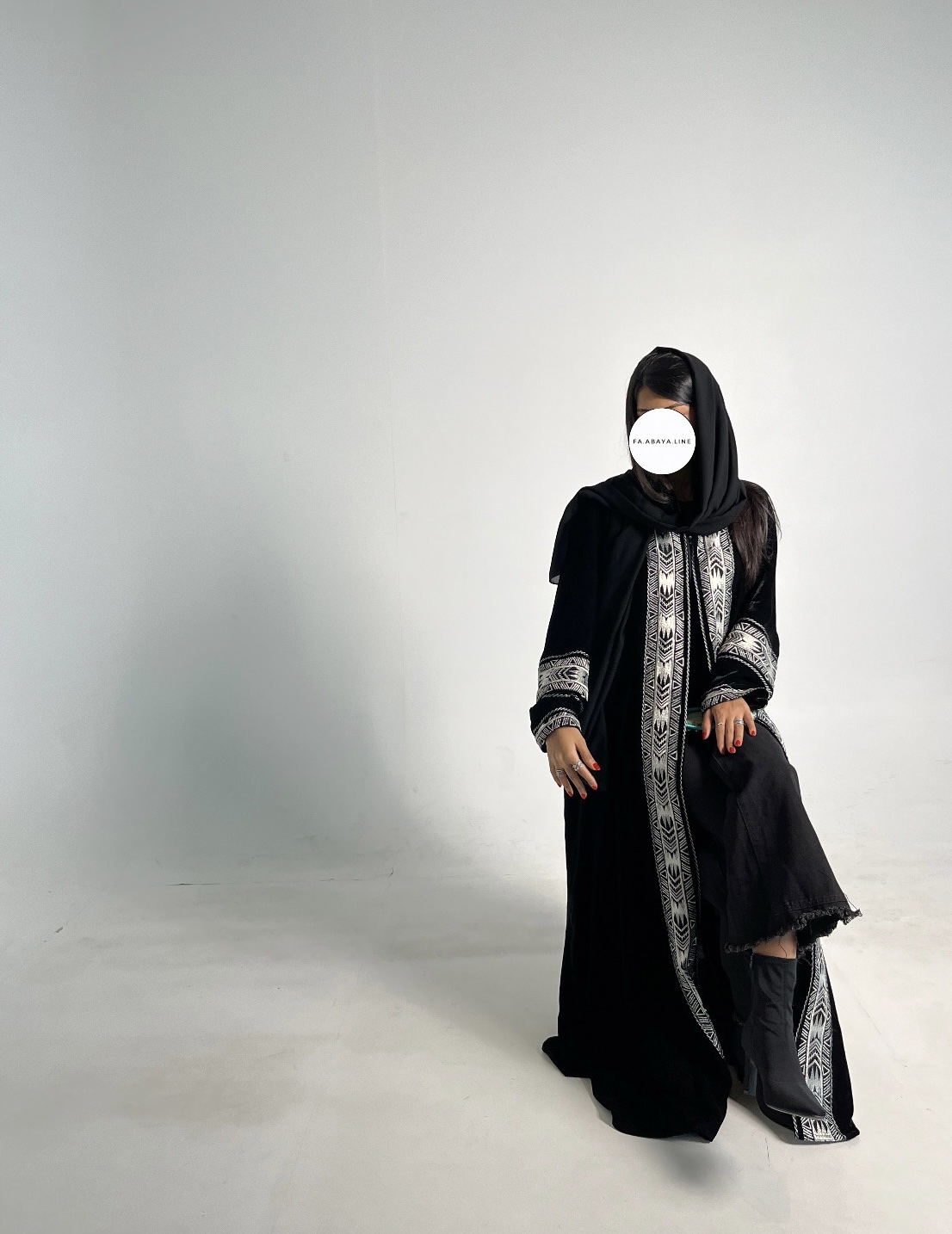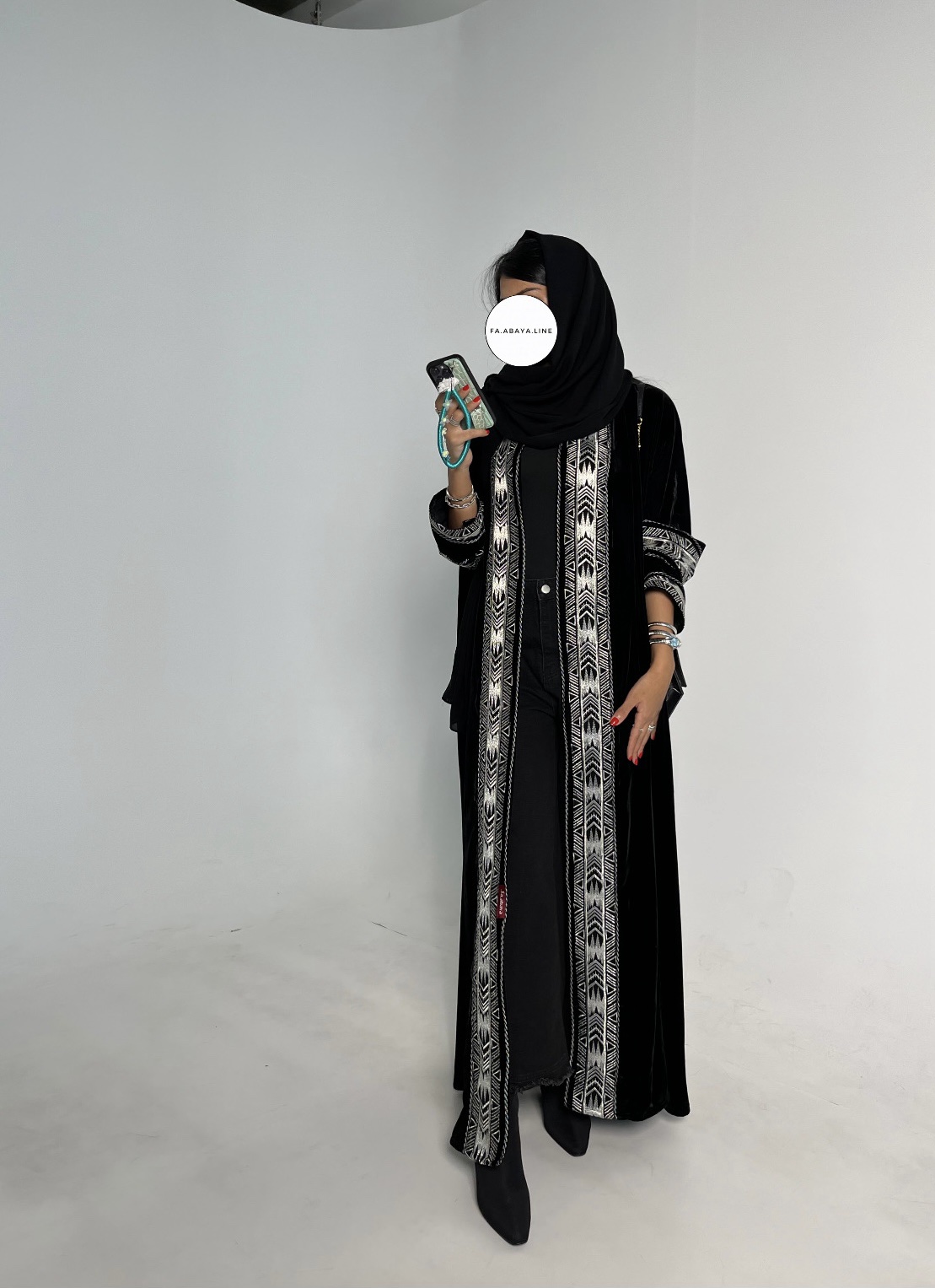 قماش العبايه لينن، القصه كلوش “تطريز باللون الأبيض مع هدب أسود