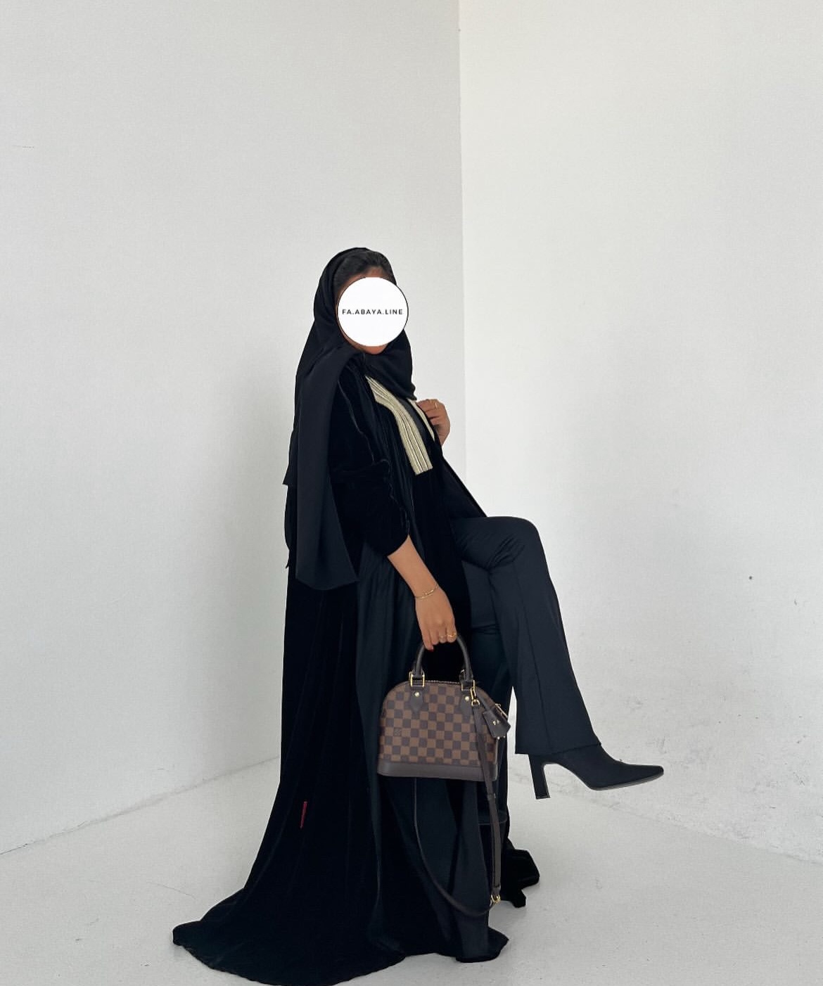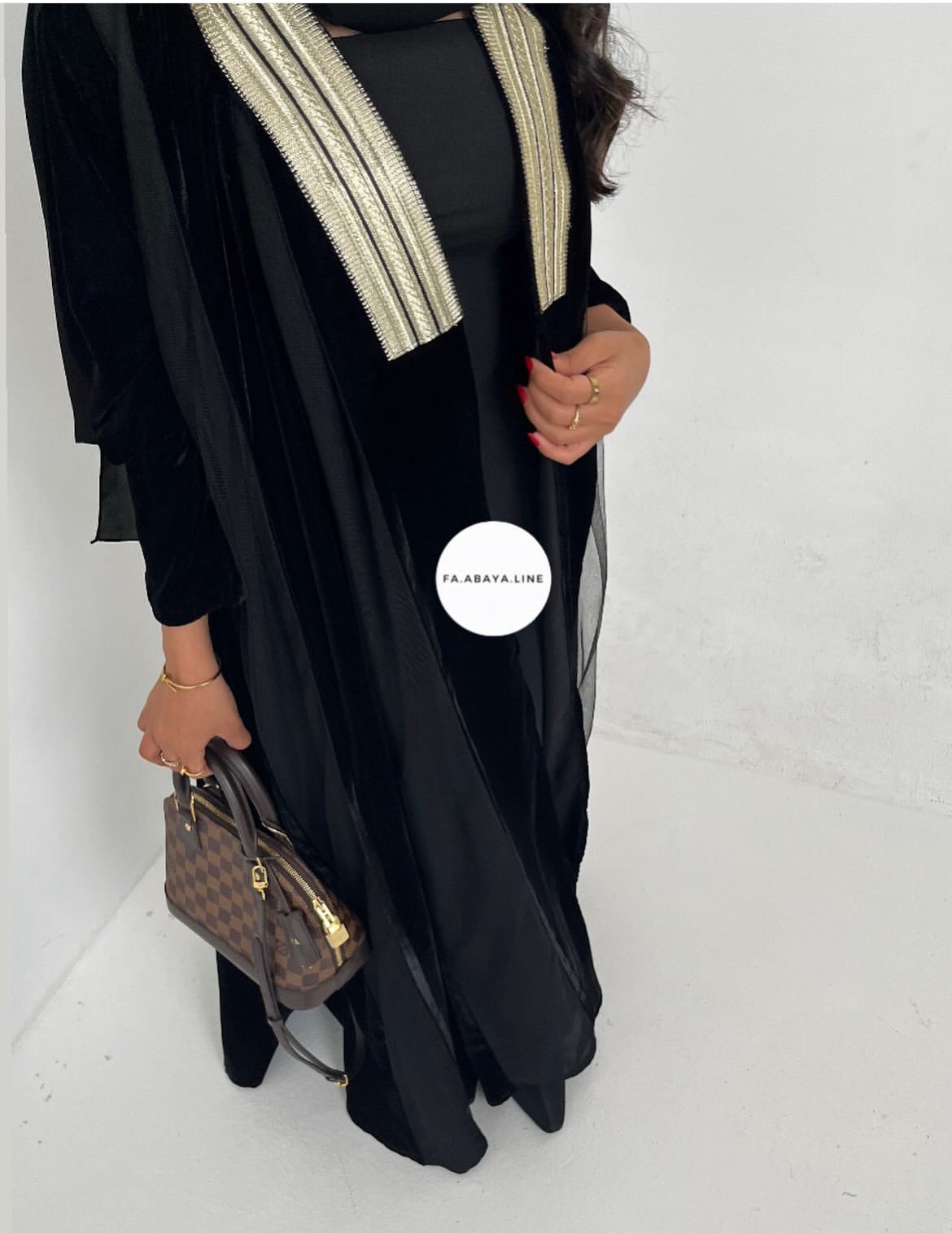 قماش العبايه لينن، القصه كلوش “تطريز باللون الأبيض مع هدب أسود