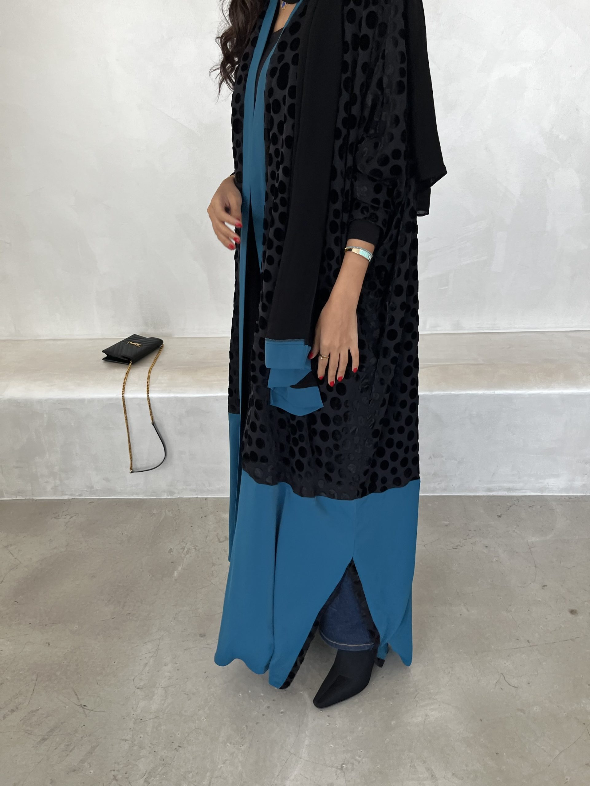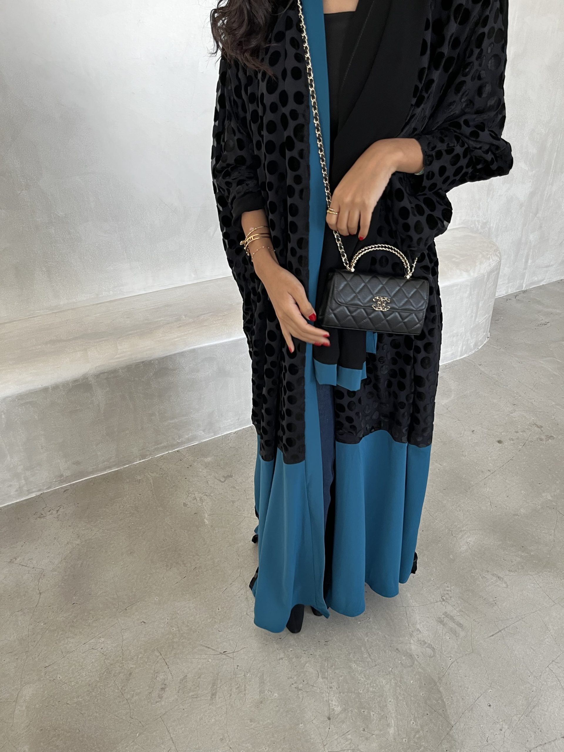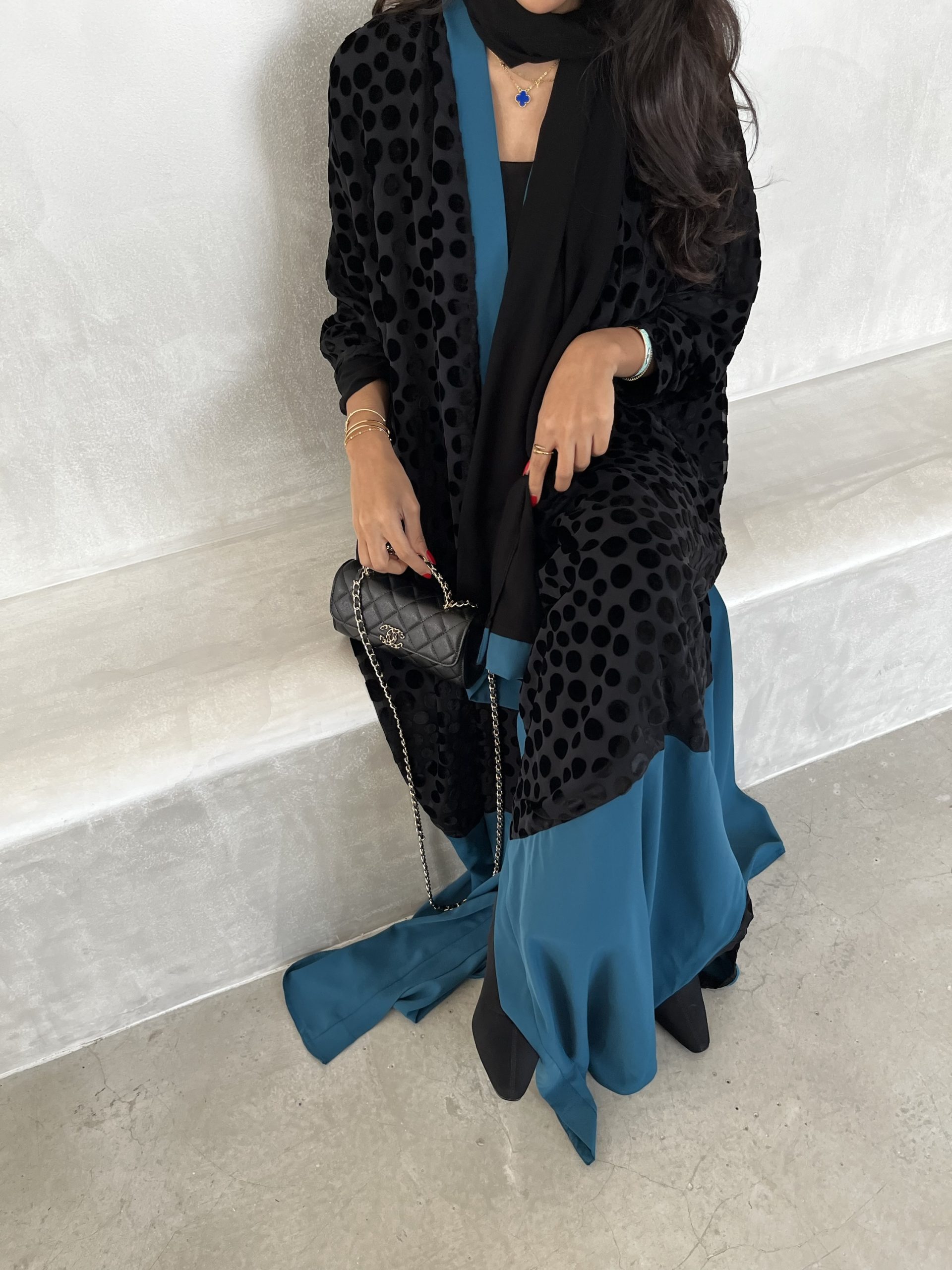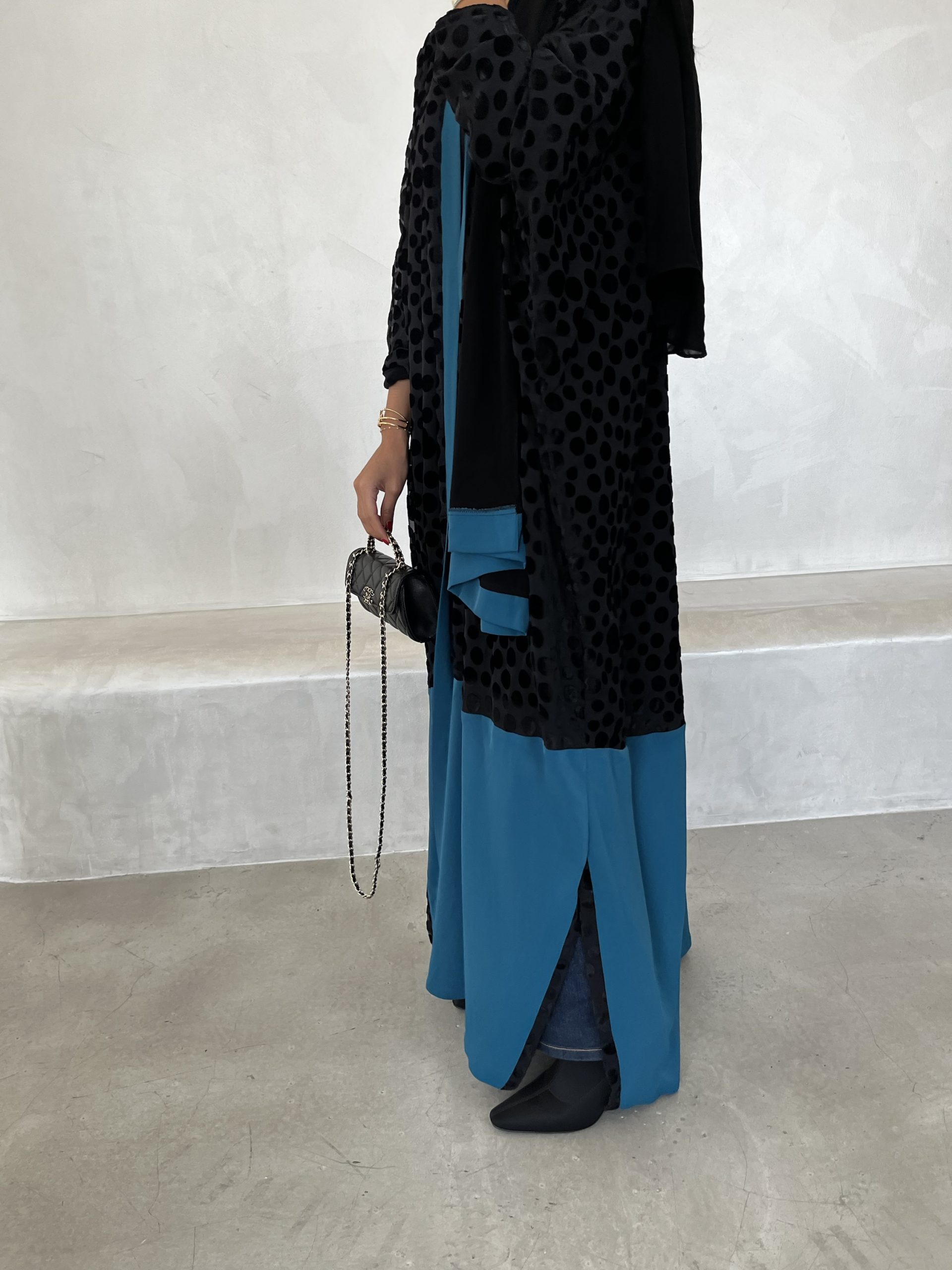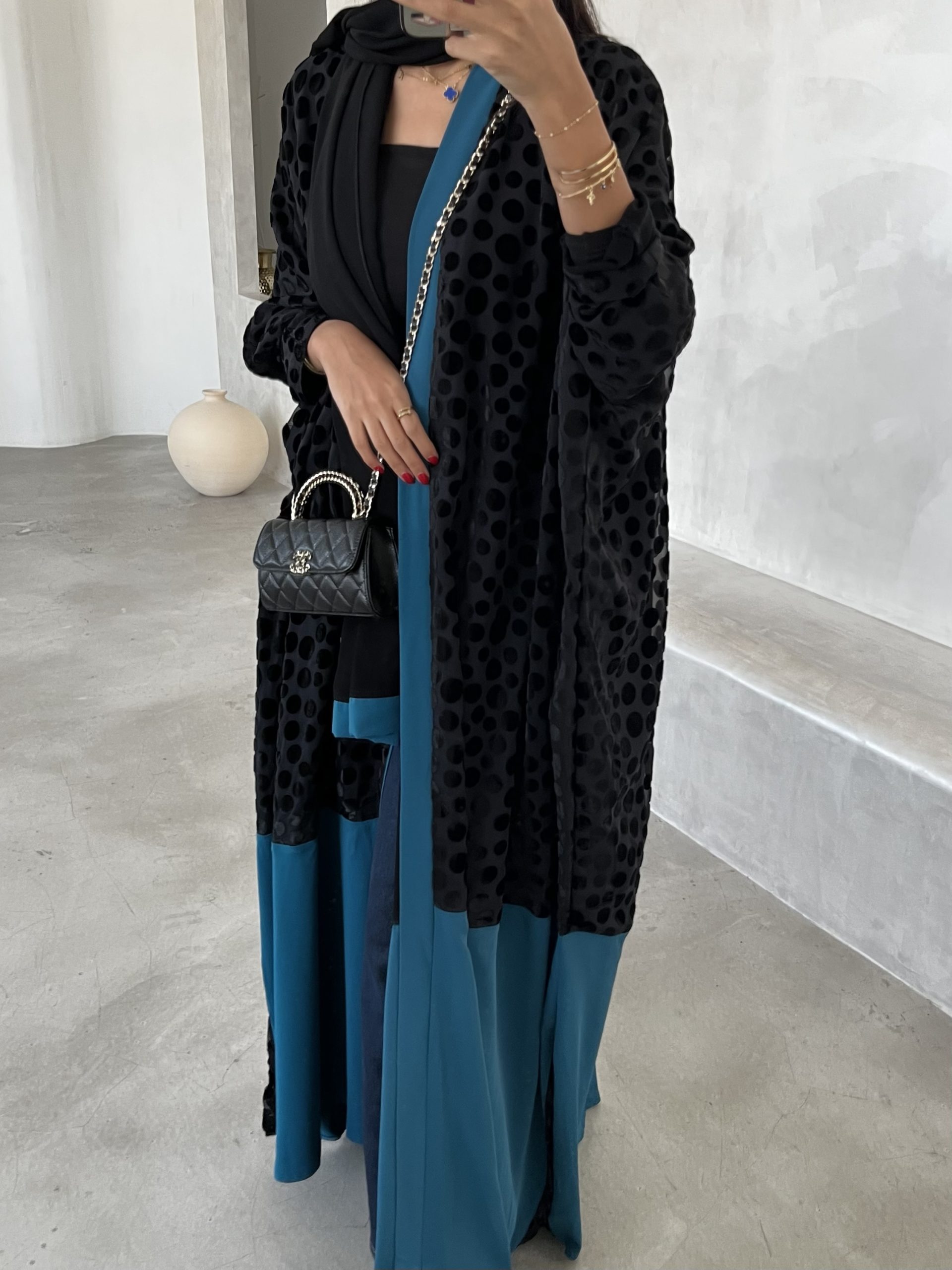 قماش العبايه لينن، القصه كلوش “تطريز باللون الأبيض مع هدب أسود