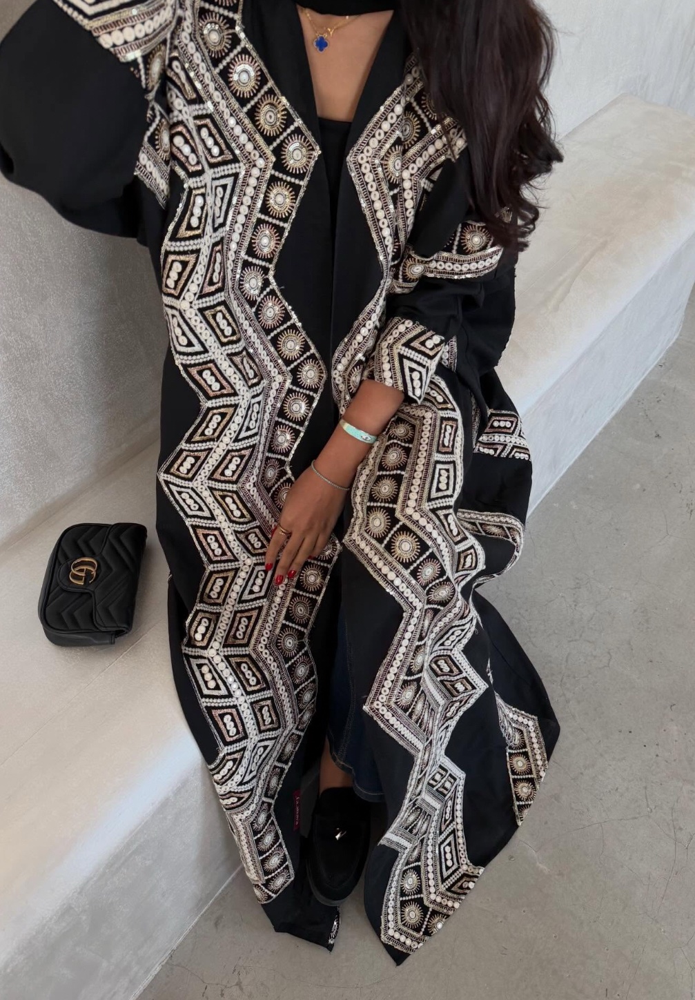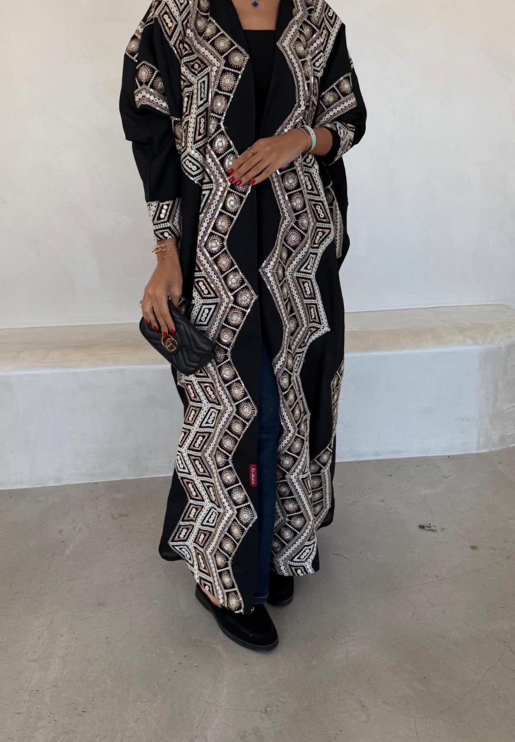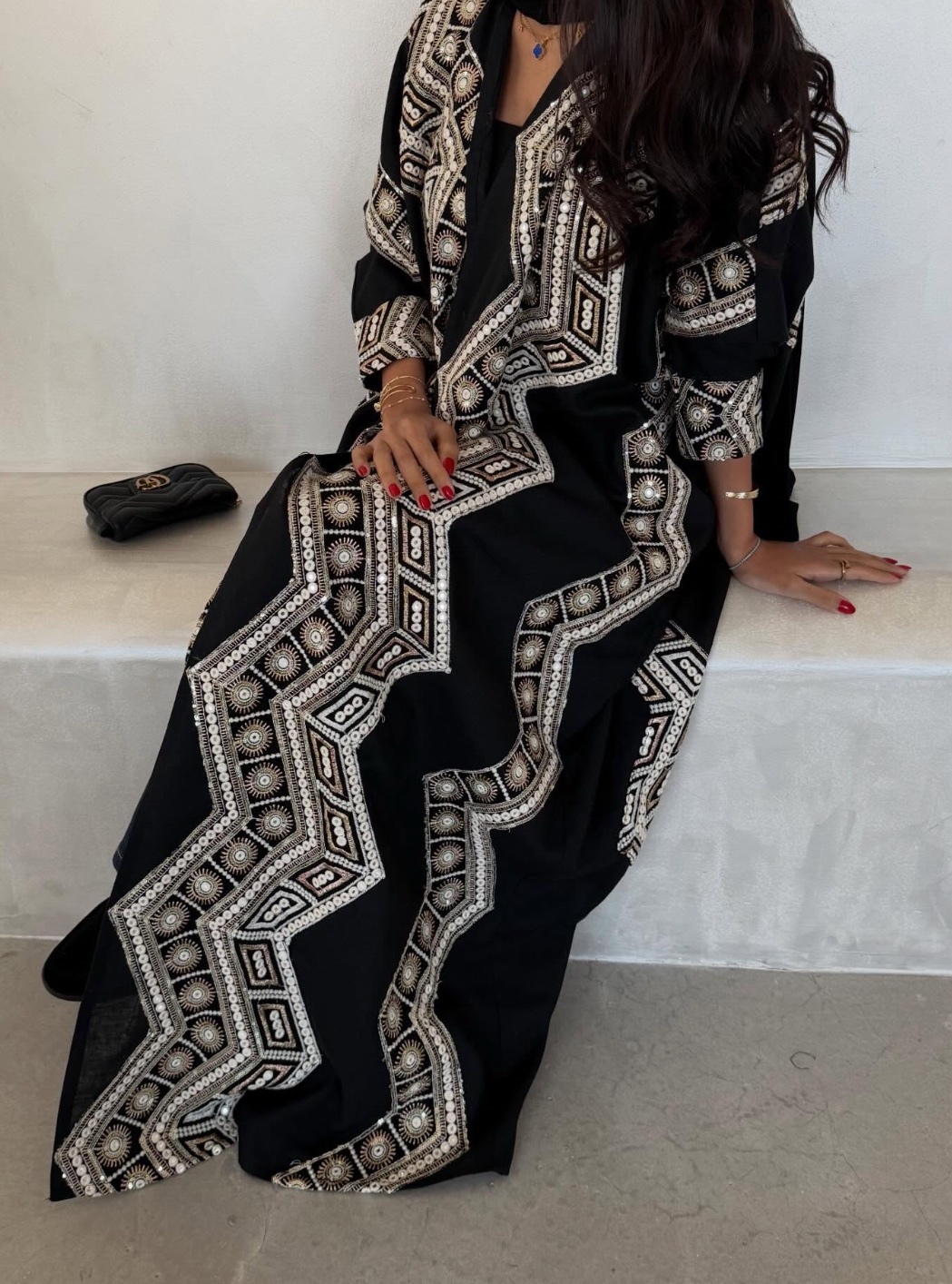 قماش العبايه لينن، القصه كلوش “تطريز باللون الأبيض مع هدب أسود